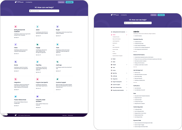 The site features an intuitive layout with clearly categorized sections covering onboarding, reporting, administrative configuration, workflow management, and integrations. A powerful search function allows users to quickly find relevant resources, reducing support friction and improving productivity.