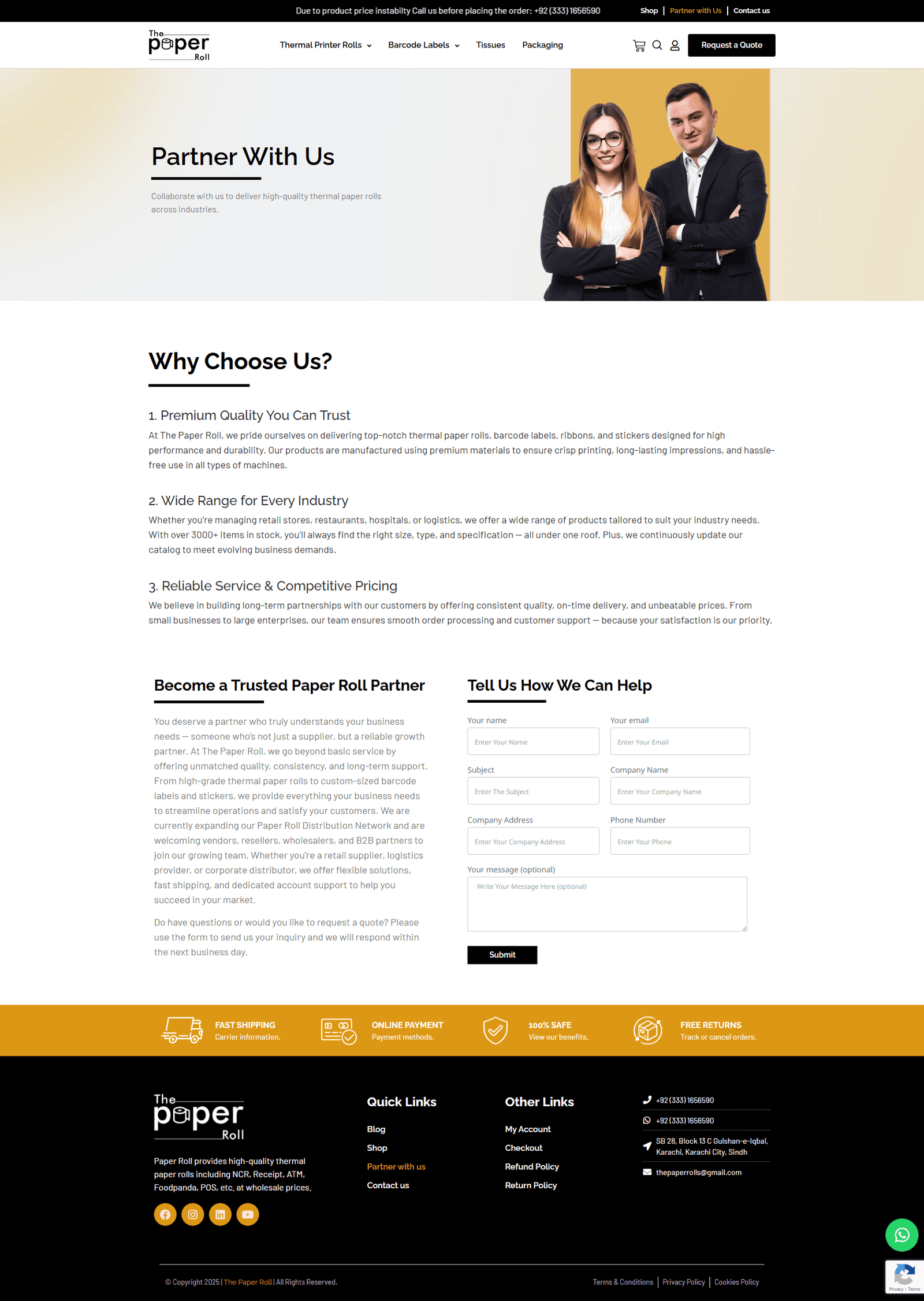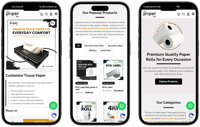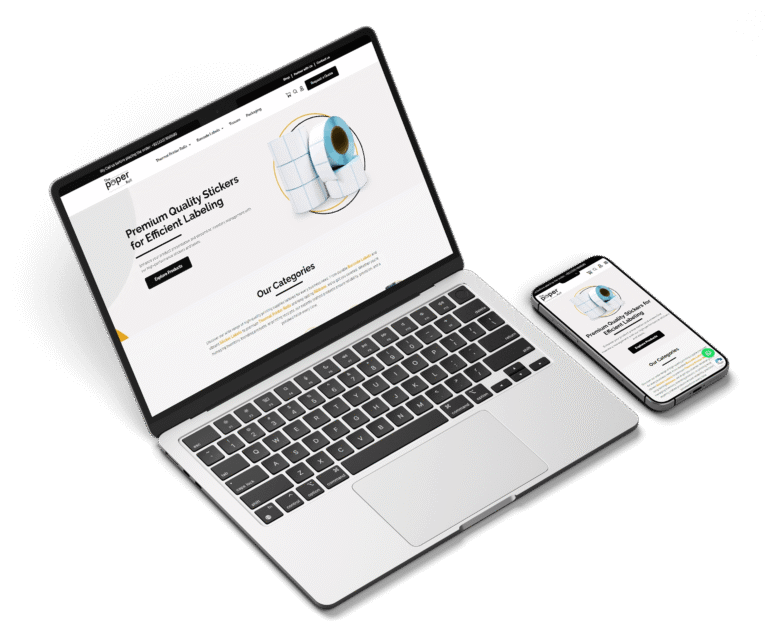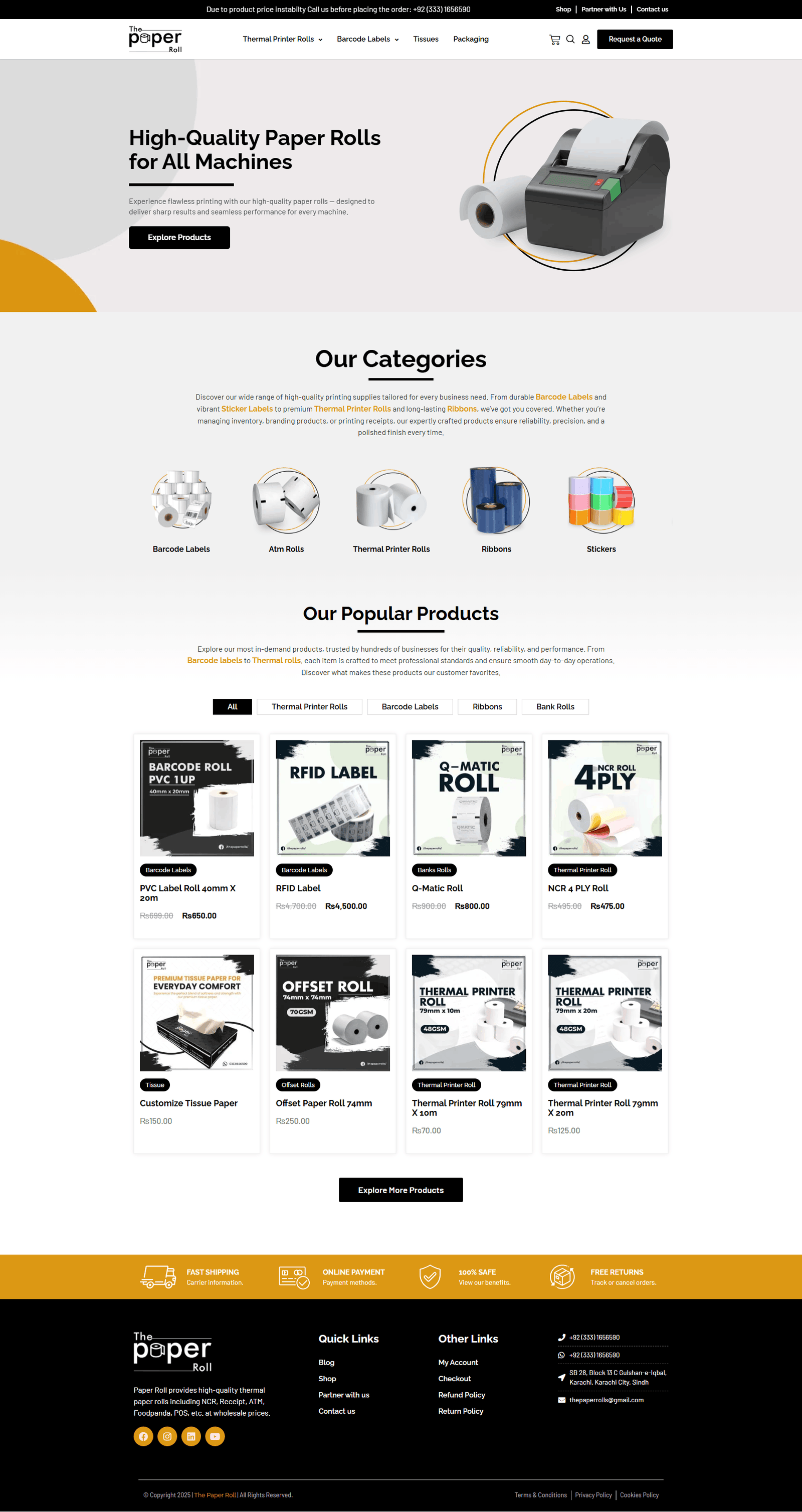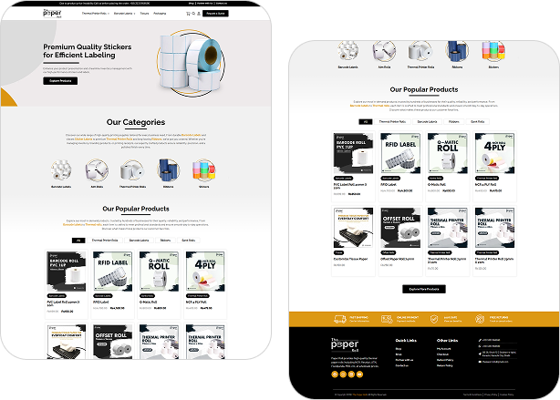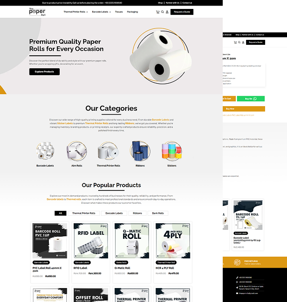 A clean, professional website design crafted for The Paper Roll, a company specializing in high-quality paper products. The layout features a bright white background with subtle gray elements and a touch of orange, giving the site a modern and inviting appearance. The top section includes the company’s logo and an easy-to-navigate menu with links to product categories like Banks, Ribbon, Barcode Labels, Thermal, and Stickers. Key actions such as “Shop,” “Partner with us,” and “Contact us” are clearly visible, along with a bold “Request A Quote” button. The main banner highlights the message “If You Are Looking For High Quality Paper Roll” with supporting visuals of a thermal printer and paper roll in use. Below the banner, users are introduced to the durability and vibrant design of the products, with a “Buy Now” button and arrows indicating a product carousel. The “Our Categories” section visually represents each product group with icons, while the “Our Popular Products” area lists top-selling items like PVC Label Roll, RFID Label, Q-Matic Roll, and more, each with an image, short description, and price. The footer reinforces brand identity and trust, offering navigation links, policies, account access, and contact information. The entire website is structured for a seamless user experience, helping visitors quickly explore and purchase from a trusted provider of premium paper rolls.