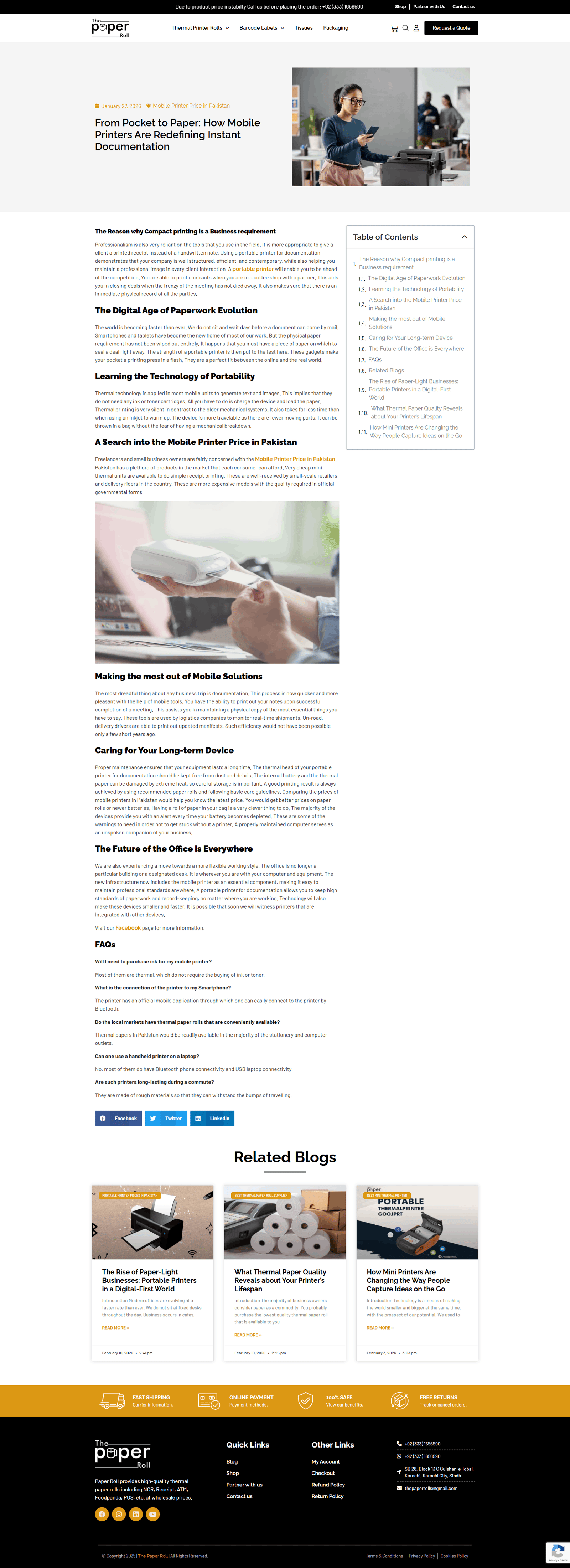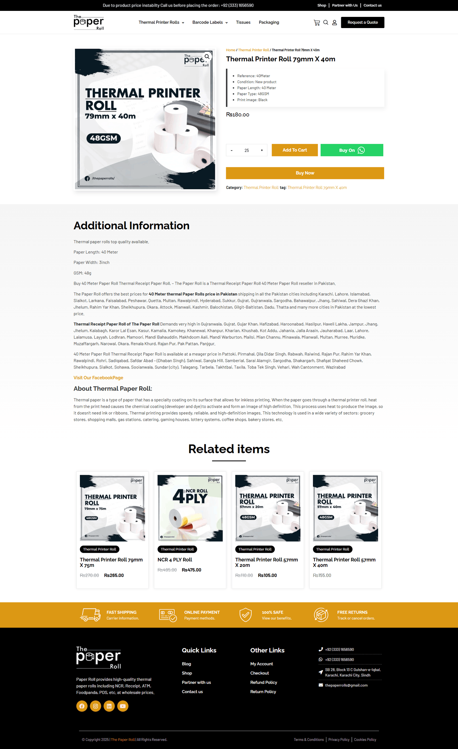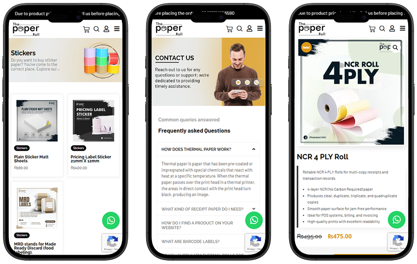 A clean, professional website design crafted for The Paper Roll, a company specializing in high-quality paper products. The layout features a bright white background with subtle gray elements and a touch of orange, giving the site a modern and inviting appearance. The top section includes the company’s logo and an easy-to-navigate menu with links to product categories like Banks, Ribbon, Barcode Labels, Thermal, and Stickers. Key actions such as “Shop,” “Partner with us,” and “Contact us” are clearly visible, along with a bold “Request A Quote” button. The main banner highlights the message “If You Are Looking For High Quality Paper Roll” with supporting visuals of a thermal printer and paper roll in use. Below the banner, users are introduced to the durability and vibrant design of the products, with a “Buy Now” button and arrows indicating a product carousel. The “Our Categories” section visually represents each product group with icons, while the “Our Popular Products” area lists top-selling items like PVC Label Roll, RFID Label, Q-Matic Roll, and more, each with an image, short description, and price. The footer reinforces brand identity and trust, offering navigation links, policies, account access, and contact information. The entire website is structured for a seamless user experience, helping visitors quickly explore and purchase from a trusted provider of premium paper rolls.